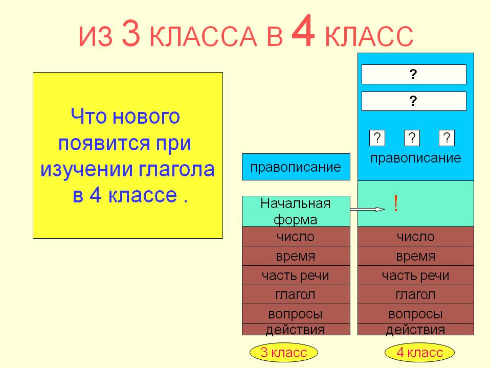 Часть речи. Глагол. Слайд 5. Из 3 класса в 4 класс. Что нового